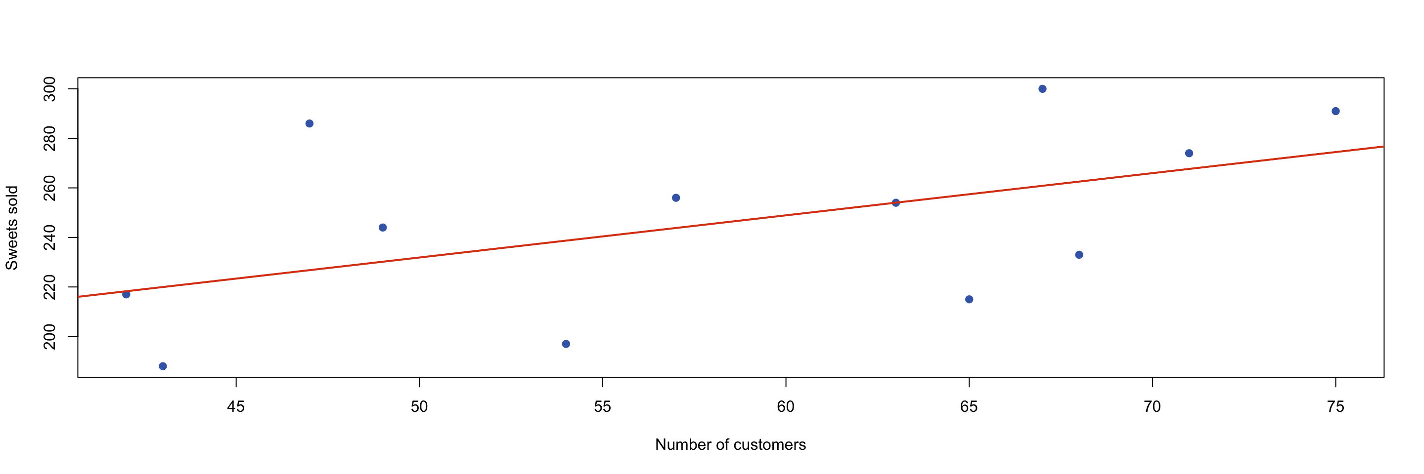 confectionery =data.frame(customers=c(43,54,65,42,68,49, 63,57,71,47,75,67),sweets=c(188,197,215,217,233,244,254,256,274,286,291,300))model=lm(sweets~customers,data=confectionery)summary(model)plot(confectionery$customers, confectionery$sweets,pch =19, col ="#3f68b6",xlab ="Number of customers",ylab ="Sweets sold")abline(model, col ="#db4315", lwd =2)